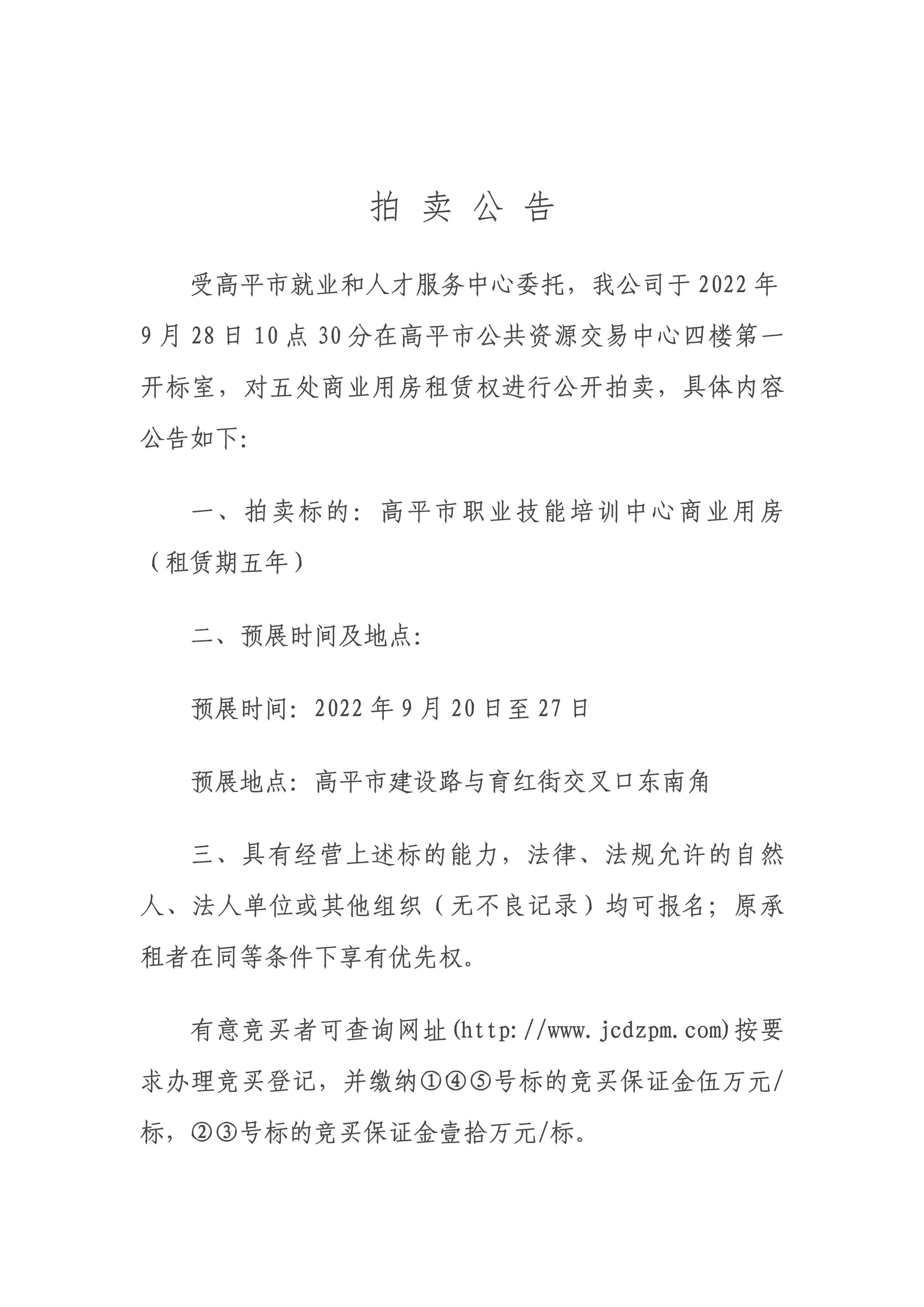 【拍賣公告】高平市職業(yè)技能培訓中心商業(yè)用房租賃權(quán)公開拍賣